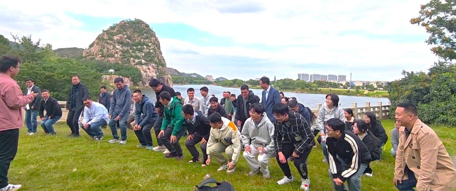 寿桃湖公园内碧波荡漾,环绕的绿树与嶙峋的奇石构成了一幅绝美的秋日画卷。平日里忙碌于教学、科研和管理工作的老师们,暂时告别了实验室的仪器与讲台,投入到大自然的怀抱中,尽情享受这难得的闲暇时光。除了惬意的徒步赏景,院工会还精心组织了趣味十足的“教练说”团队游戏,在游戏口令下,老师们不断做出“正确”或“错误”的动作,引得大家哈哈大笑,活动现场其乐融融,点燃了大家的参与热情。本次拓展活动不仅让老师们切身体验了青山绿水,而且充分展现了物理学院教师队伍活力四溢和团结向上的精神风貌。