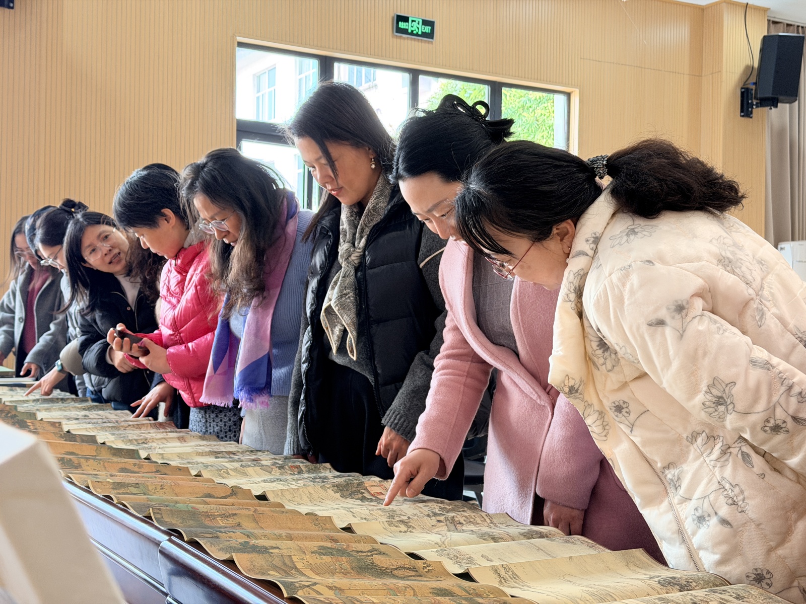 文化浸润,别具匠心。学院黄国华老师带来珍藏的《姑苏繁华图》《清明上河图》,与大家共赏传世画卷之美;长期在苏州博物馆担任志愿讲解员的吴芳老师,细致解读画作背景、艺术特色与历史内涵,现场书香浓郁、雅趣盎然。