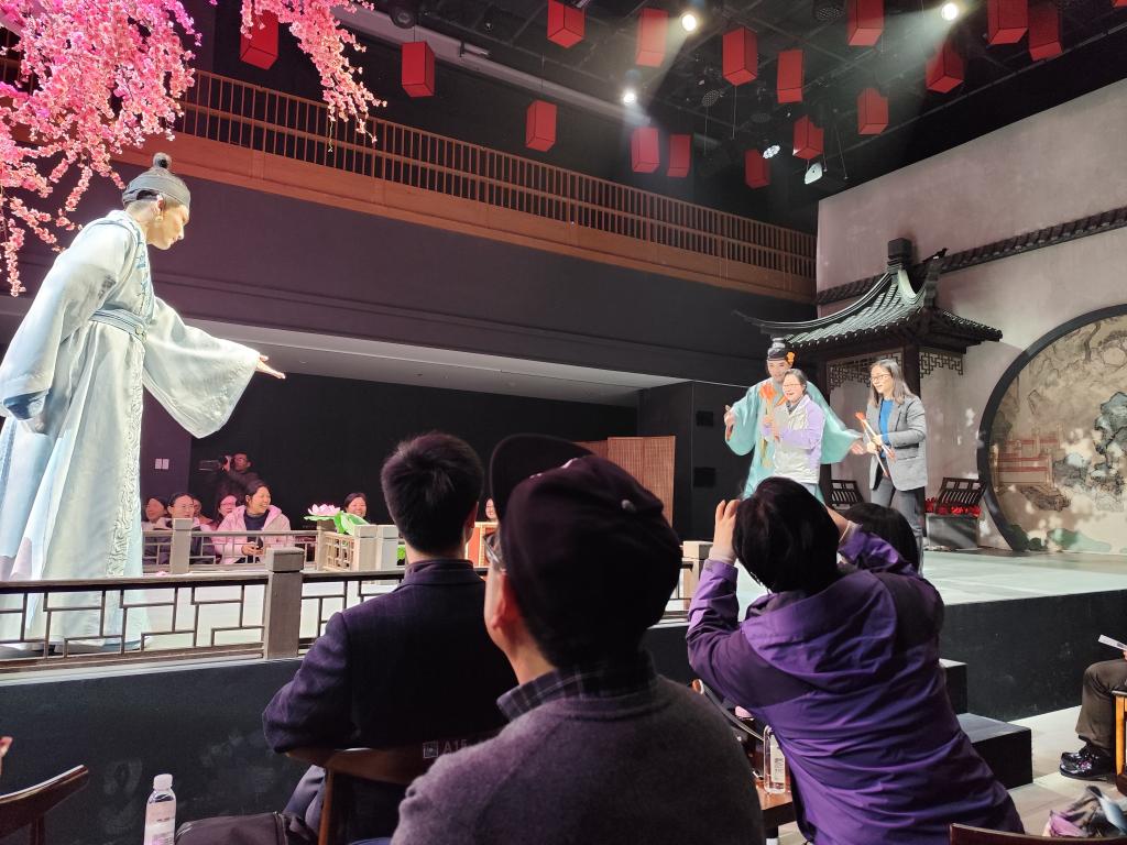 活动现场,音乐剧巧妙融合传统与现代元素,既有婉转典雅的唱腔,又不乏新颖灵动的编排,令观众耳目一新。演出过程中,演员多次走进观众席,与台下亲切互动,热情邀请女教师们一同参与剧情。台上台下情感交融,掌声与戏曲声此起彼伏,气氛一次次被推向高潮。互动环节中,老师们纷纷举起手机记录精彩瞬间,或凝神欣赏,或会心一笑,现场欢声笑语不断。在悠扬旋律与热烈互动中,女教师们卸下平日忙碌,沉浸于艺术的雅韵之中,真切感受着传统文化的深厚底蕴与时代新声的交相辉映。