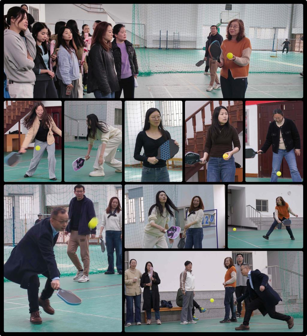 在匹克球体验环节,有经验的老师为零基础的教职工现场教学,耐心讲解握拍、击球与对打技巧。老师们踊跃上场、轻松对练,在欢乐互动中尽情享受运动乐趣。
