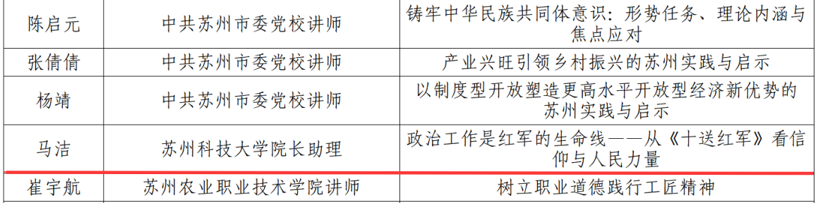 日前,苏州市总工会发布了《关于公布2025年苏州职工思政教育“百师百课”推选结果的通知》,我校马克思主义学院马洁老师及其课程《政治工作是红军的生命线——从《十送红军》看信仰与人民力量》入选。