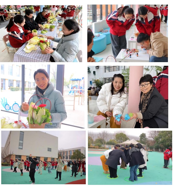 创意手作环节中,教职工们分组参与不同项目的体验:香皂手作区,大家制作仿真花造型手工香皂,感受手工创作的乐趣;宋锦挂饰区,体验非遗宋锦的工艺之美,传承传统文化;蔬菜花束区,将新鲜蔬菜与鲜花创意搭配,制作独具特色的“春日蔬菜花束”;团扇制作区,用干花、永生花装点空白团扇,定格春日美好。指尖流转间,高校教师与幼教一线工作者交流互动,现场气氛温馨融洽。随后开展的趣味团建将活动推向高潮。“圈里圈外”考验反应速度,“勾肩搭背”挑战团队默契,呐喊声与欢笑声交织,充分展现了女性教职工团结协作、昂扬向上的精神风貌。